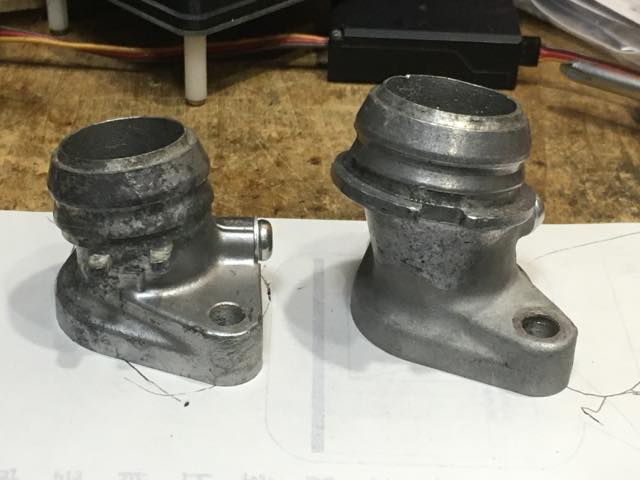 eBayに発注してたマニホールドが到着したので洗浄して確認してみたのだが、なんか妙だ。VMキャブ用と比較すると、角度がおかしい気がする。