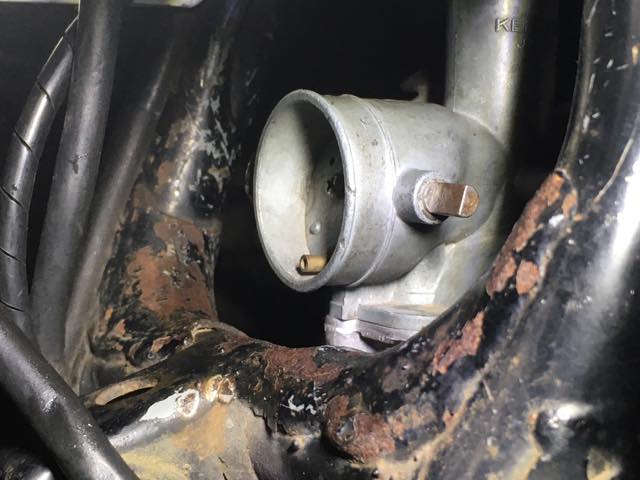 そして本日、朝から取り付け作業を行なった。マニホールドはすでに固定してあるので、インシュレータを挟んでキャブを取り付け、エアフィルタを取り付け、バッテリ関連を全部戻し、タンクをどけてスロットルケーブルを交換。なお、チョークケーブルは後日ツインキャブ化するときにまた使う可能性があるので、車体内に残しておいた。