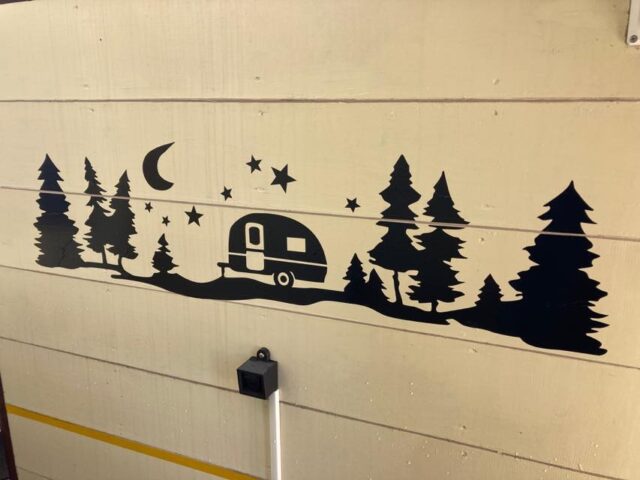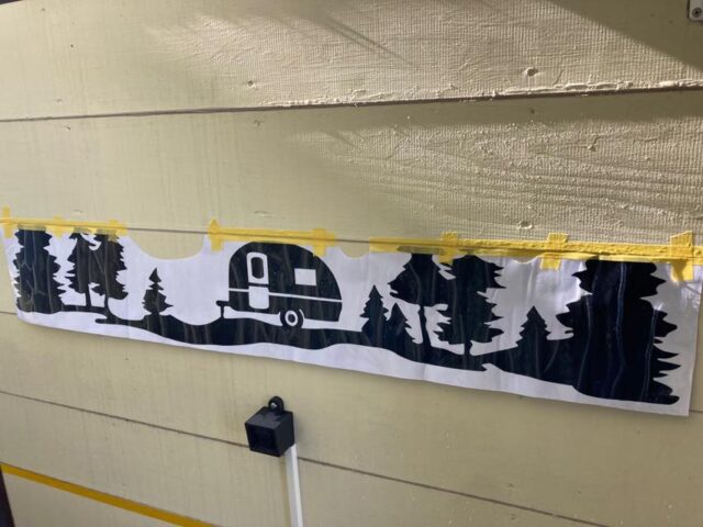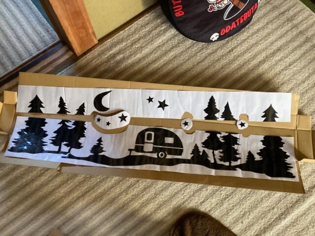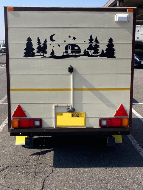ネットで買ったキャンパー向けのカッティングステッカーを後面に貼ってみた。板の継ぎ目があるのでちょっとカットして色々細工。