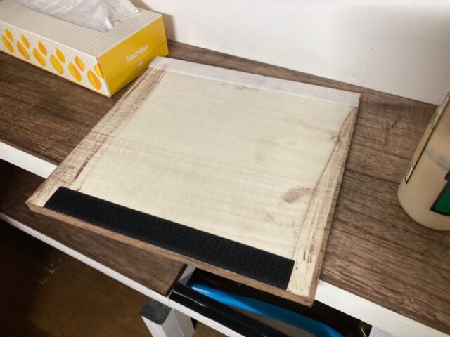 面ファスナーを確保してきたので、色々と加工を。棚の周囲に柔らかい方の黒の面ファスナーを取り付ける。これは糊付きで、補助としてタッカー打ち込みもしてある。