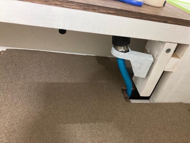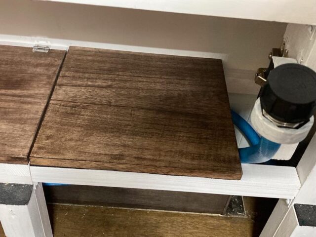 カウンタ下の旧水タンク設置場所を塞ぐ作業を開始した。といっても、給水口があるので全部塞ぐワケではないけど。