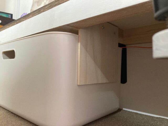 まずは壁側と手前側に天板保持のための桟を取り付け、ざっくりといつものミルクペイントで塗ってしまった。天板は面ファスナ(マジックテープ)で固定する予定。