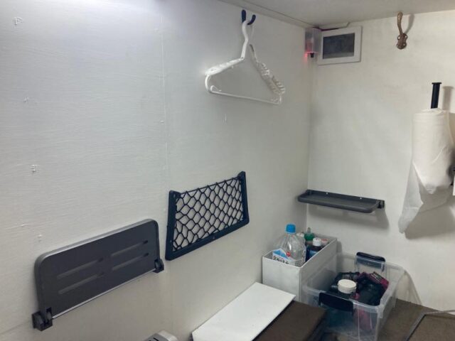 壁の大半は3mm厚のシナベニアなのでネジが立たないが、裏に杉角材が通ってるトコなら大丈夫なので、取り付け可能な場所を探して取り付けた。まぁ、色々入れるのに良かろう。