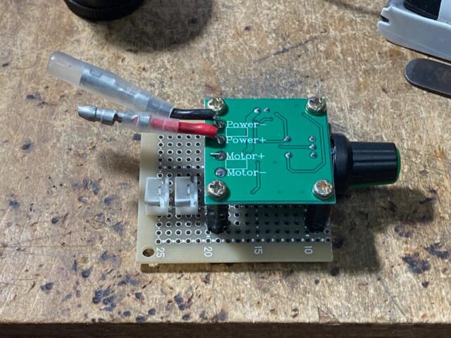 これをアダプタと配線の間に割り込ませて実験。なんか絞っていくと片方回らなくなるけど、まぁいいか(笑)。