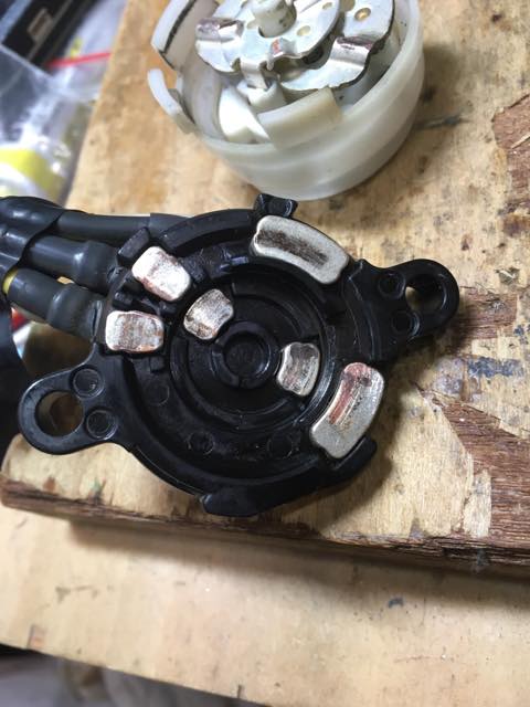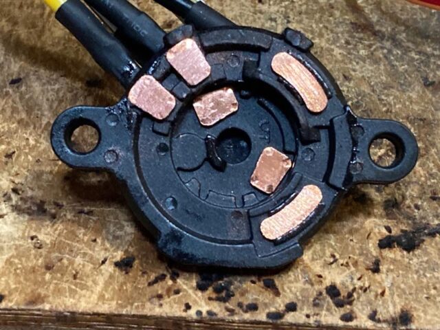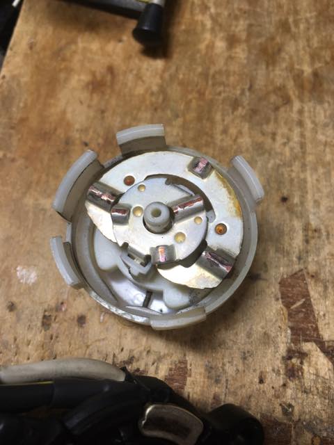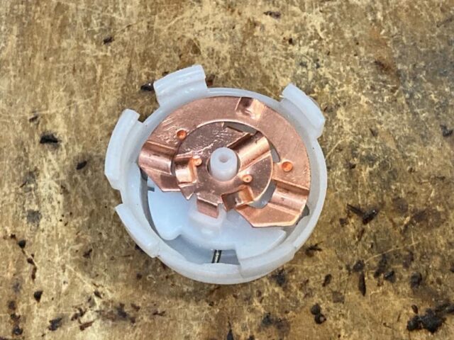あと、組み替え時に気づいたコトが一つあって、内部の回転する方の電極を抑えているバネのうち、以前熱で死んだ方のバネは明らかに弱くなってる。どっちが先かはわからないが、長期的な熱でバネが徐々に死んでいき、接点圧が落ち、接触不良からのスパークでダメになっていくって感じなのかしらね。この辺も新しいのがどう変化していくのか気になるトコロ。