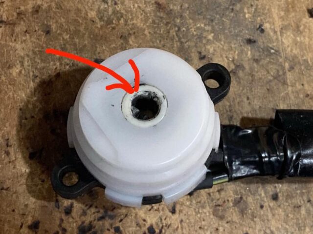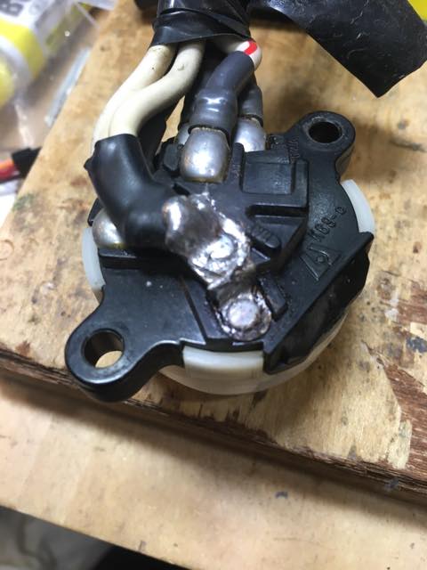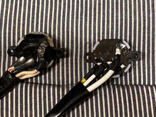 だいぶ前のコトやが、運転中に足元になにか銀色の液体の雫がタレたコトがある。んで、妙な匂いも。慌ててクルマを停め確認したら、足元に落ちていたのはハンダだった。どこからか…というと、メインキースイッチのハンダが溶け落ちてた。