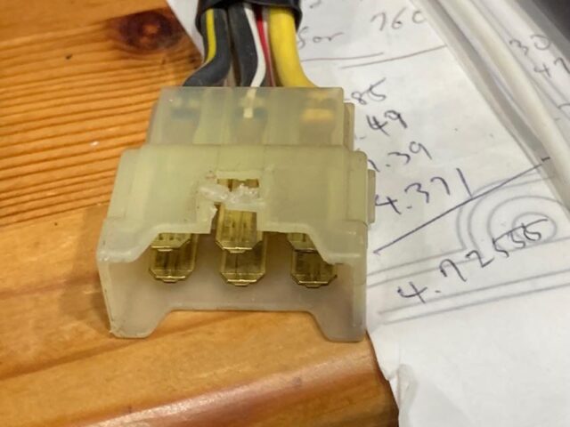 このコネクタは普通に用品店等で売ってるので、それを買ってくる予定。この端子の場合、咥えるコトができるケーブルの最大太さは2mmスクエアらしいので、白の2mmスクエアのケーブルも買ってこよう…と、思ったのだけど、よく考えたら新しい方はかなりケーブルが長いので、切り詰めて余った奴を流用した方が早そうや。。