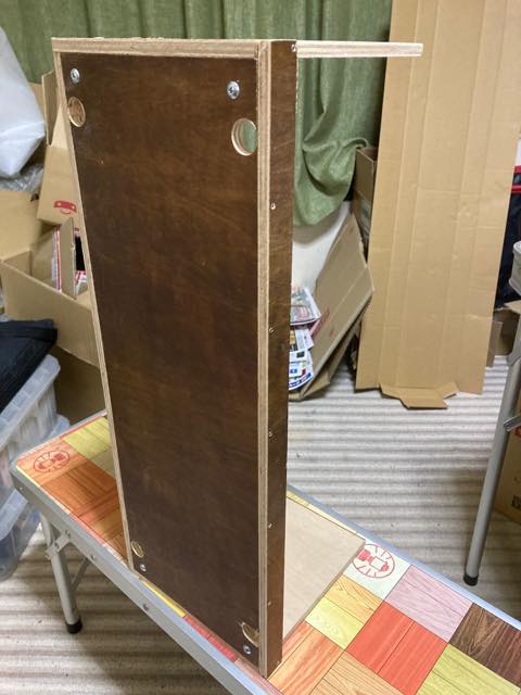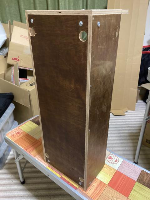 とはいえ、設計そのものは排水タンクと基本的に同じもので、排水タンクの反対側に設置する。ただ、コッチは排水タンクと違い10kgもの荷重に耐える必要はないので、板厚を9mmとし、先日分解して取り外したベッド等の天板の廃材で組み立てるコトにする。あれシナベニアでそこそこ強度あるからな。